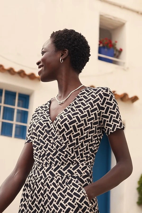 - V-neck wrap front banded waist: it’s made to flatter