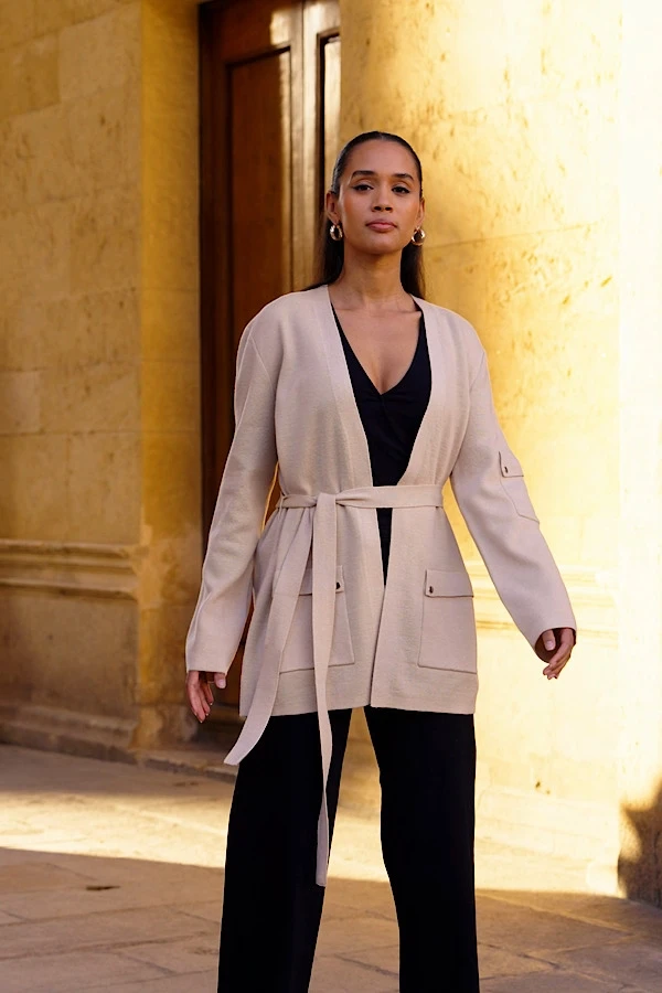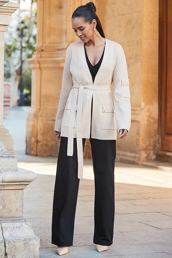 - Wear it open or cinch it in with the belt tie