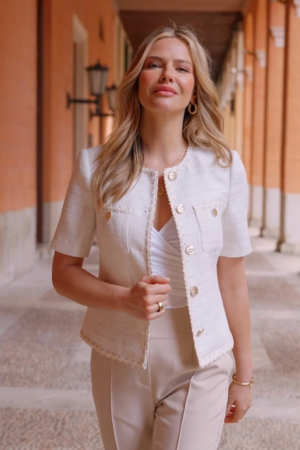 - Crafted from luxurious boucle fabric with a shimmering metallic trim