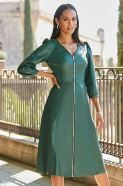 Navy Blue Faux Leather Short Sleeve Popper Front Shirt Dress