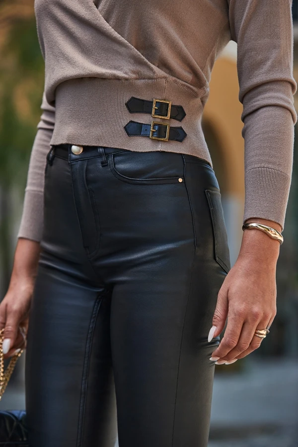 - Relaxed fit falls to a banded waist with a cool double buckle detail